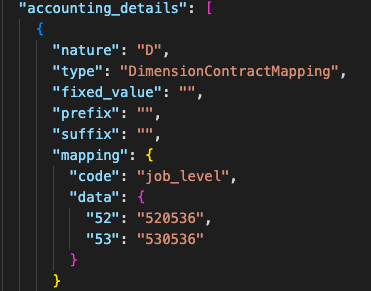 DimensionContractMapping: Esta es una configuración de tipo "FIJA", que permite definir una dimensión de contrato y asignar una cuenta contable específica a cada uno de los valores de dicha dimensión. Al seleccionar este tipo, el sistema solicitará la creación del mapping. A continuación, se muestra cómo luce el objeto una vez que ha sido completamente configurado.
