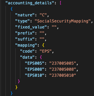 SocialSecurityMapping: Esta es una configuración de tipo "FIJA", que permite definir un tipo de fondo de seguridad social (EPS o AFP) y asignar una cuenta contable específica a cada uno de los fondos usando el código de la administradora. Al seleccionar este tipo, el sistema solicitará la creación del mapping. A continuación, se muestra cómo luce el objeto una vez que ha sido completamente configurado.