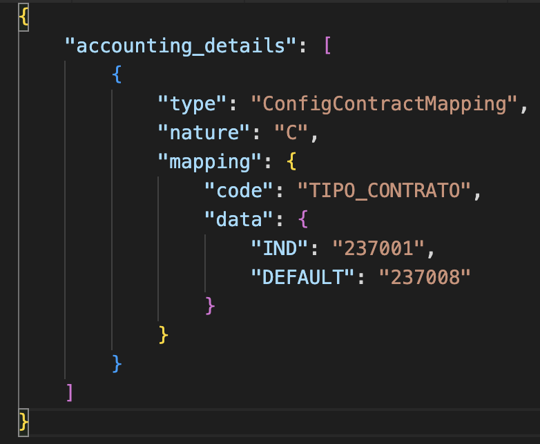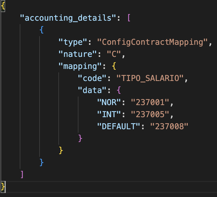 ConfigContractMapping: Esta es una configuración de tipo "FIJA", nos permite definir un tipo (TIPO_SALARIO o TIPO_CONTRATO) y asignar una cuenta contable específica a cada uno de los código del tipo seleccionado, también tiene una código especial “DEFAULT” para establecer por defecto una cuenta para los tipos no homologados. Al seleccionar este tipo, el sistema solicitará la creación del mapping. A continuación, se muestra cómo luce el objeto una vez que ha sido completamente configurado.